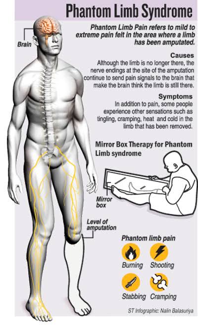Phantom limb syndrome is a condition where people who have had limbs amputated still feel pain, and other sensations as if the limb is still there. This happens because the brain keeps getting signals from the nerves that used to carry impulses from the missing limb. Even after the limb is gone these signals can cause real uncomfortable sensations that the brain interprets as coming from the amputated area.