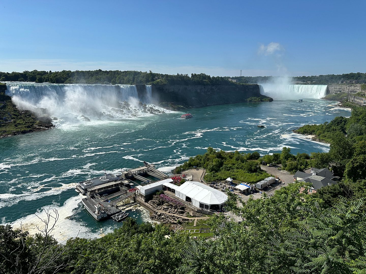 I saw the signs and booths for Niagara City Cruises on the way down the hill and decided we should go on it. So, we rushed to the ticket booth and got our tickets to get on the next cruise. Because it was still relatively early, we did not have to line up for long to get onto the cruise. While walking down the long ramp, everyone was handed a thin red plastic poncho to keep themselves from getting wet. We also saw Rainbow Bridge while waiting to board the cruise. Rainbow Bridge connects USA and Canada over the Niagara River and is a border crossing. Our plan was to walk across the bridge into the USA after we finish our cruise ride.