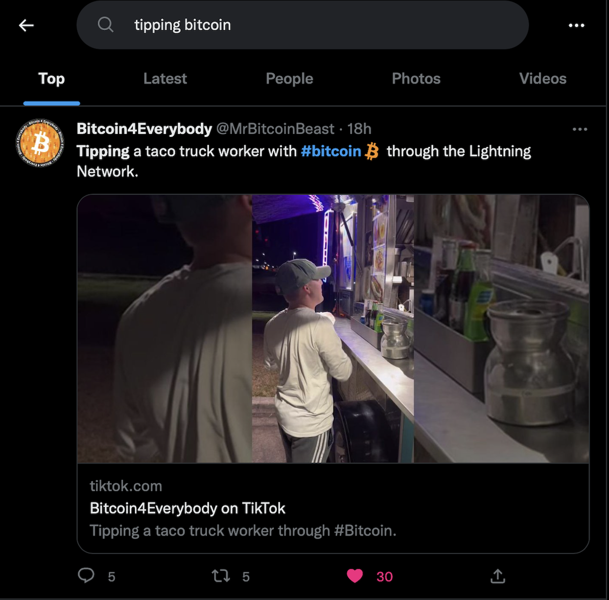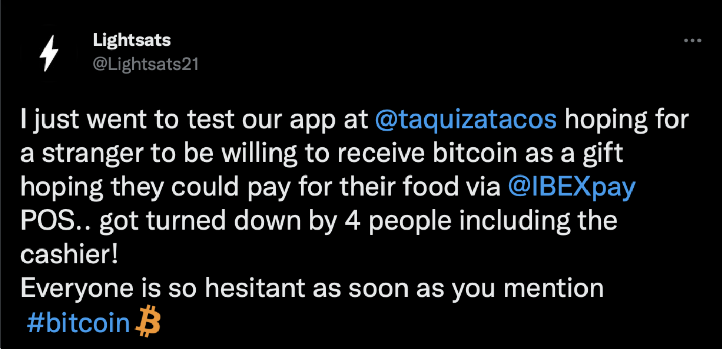 - Went to do user research to Taquiza in South Beach, to see if a random person would accept bitcoin as a gift via Lightsats so they could pay for their dinner or drinks, I did not have much success. As soon as I mentioned the word “Bitcoin” everyone got so hesitant. https://twitter.com/Lightsats21/status/1587977411433533441