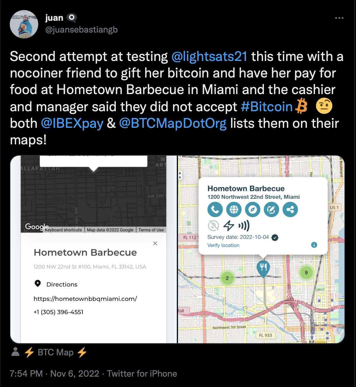 - Tried a second time with a nocoiner friend to test sending her bitcoin via Lightsats so she could pay for her food and drinks, this time I selected a different location called Hometown Barbecue which was listed both on btcmap.org & ibexpay.io but the staff said they did not accept bitcoin payments. The problem I usually see is that when venues start accepting bitcoin they don’t train their staff and don’t know how to https://twitter.com/juansebastiangb/status/1589421062416367618