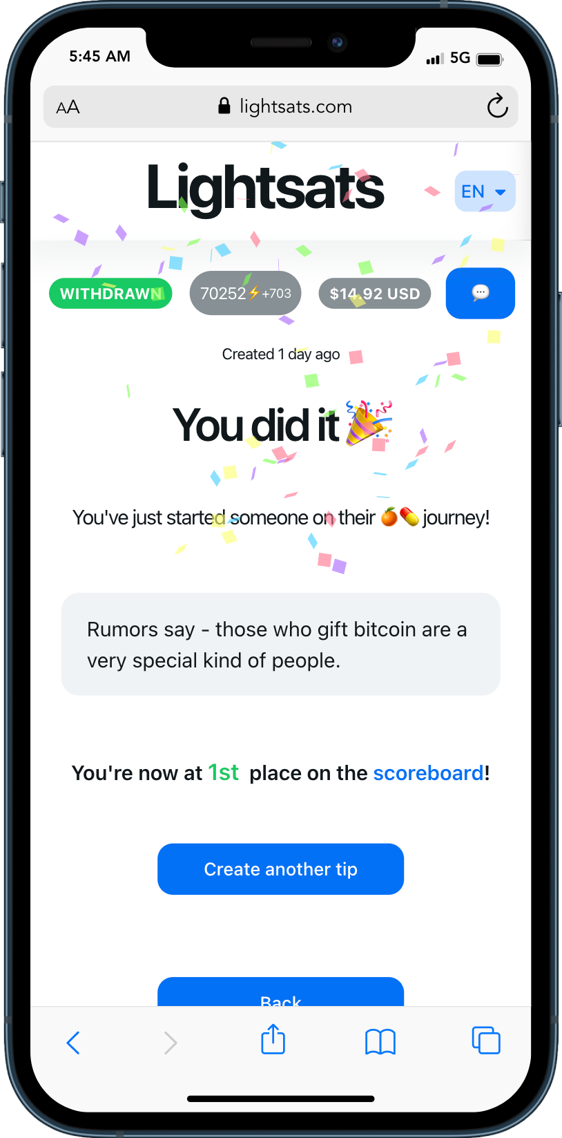 - We added a new confirmation page for a Tipper once the tips/gifts they have sent out have been withdrawn with an encouraging message plus a call to action with their ranking on the scoreboard and a link to visit it.