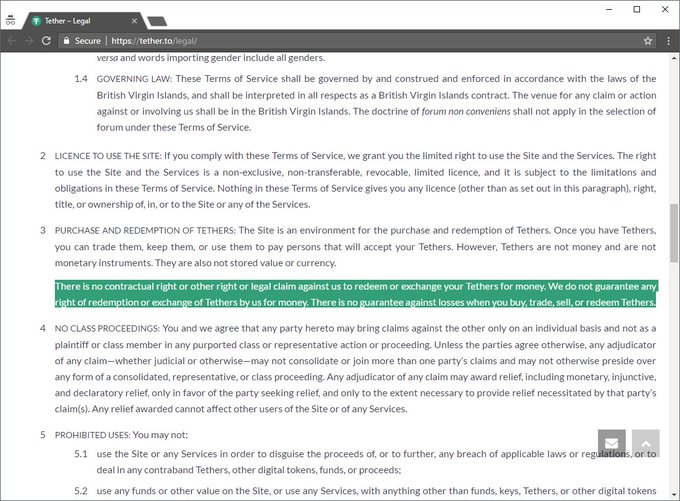 8.314 BitcoinTalk post analysing Tether terms of service notes that "Tethers are redeemable subject to the condition that they're not."