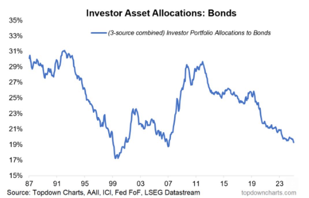 Fixed income allocation is at its lowest level since the 2008 crisis, signaling that investors remain predominantly positioned in equities.