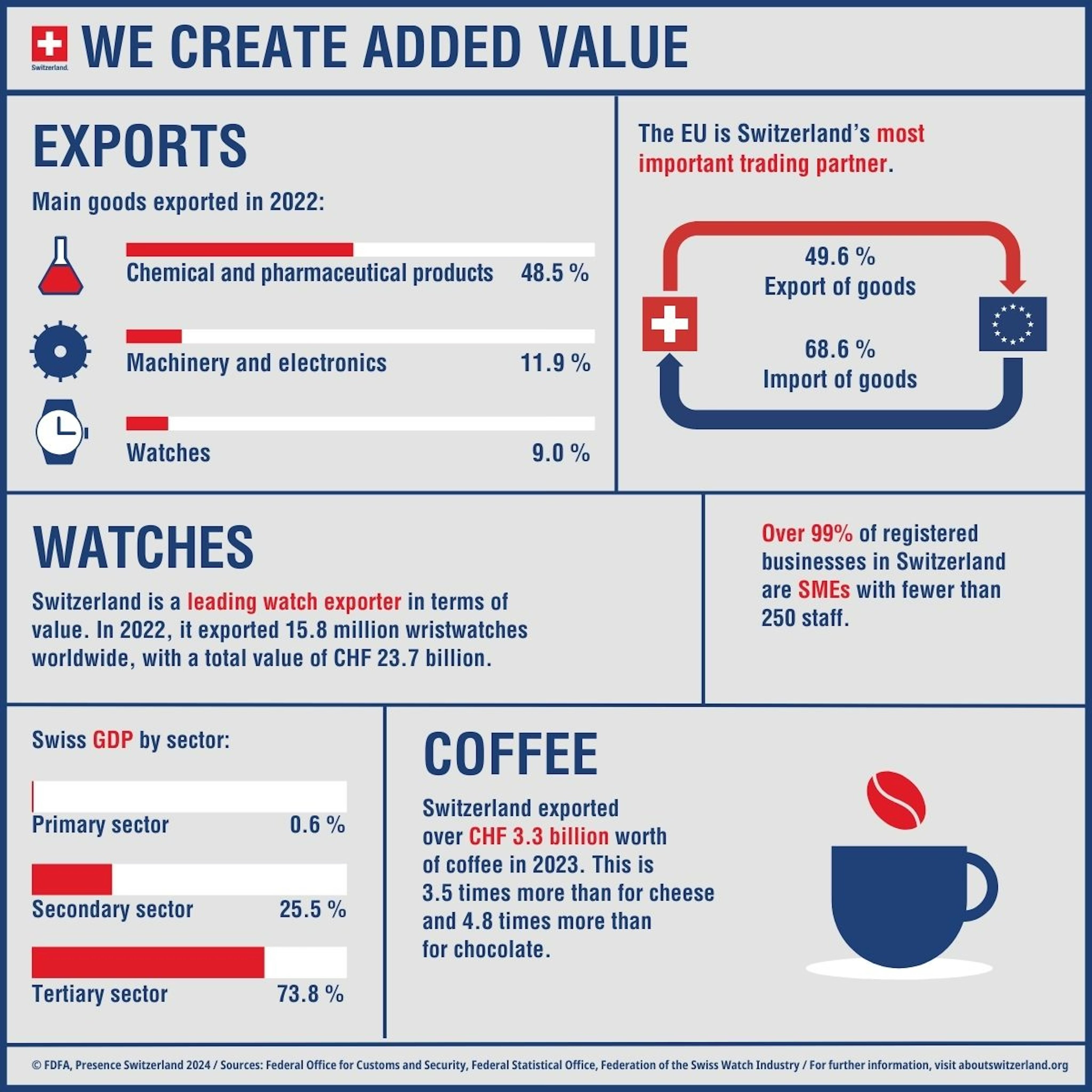 Industry, on the other hand, accounts for almost 25%, nearly three times the proportion of France and Germany. Switzerland is, in fact, one of the most advanced industrial economies in the world.