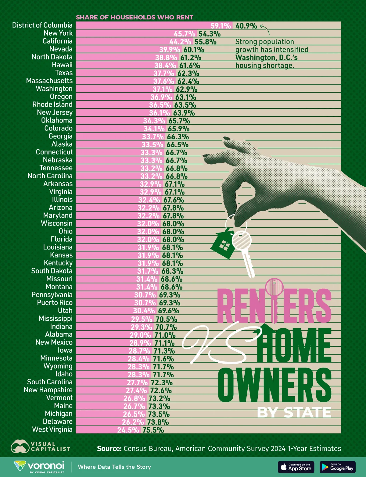 About one in three U.S. households rents, a ratio that has stayed surprisingly steady over the past six decades.But with mortgage rates soaring from 2.7% in 2020 to almost 7% today—and home prices continuing to climb—the share of renters has edged up. Today, it takes $121,400 to afford a typical home, or 43% higher than the average salary.This graphic shows the share of Americans renting versus owning by state, based on data from the U.S. Census Bureau.