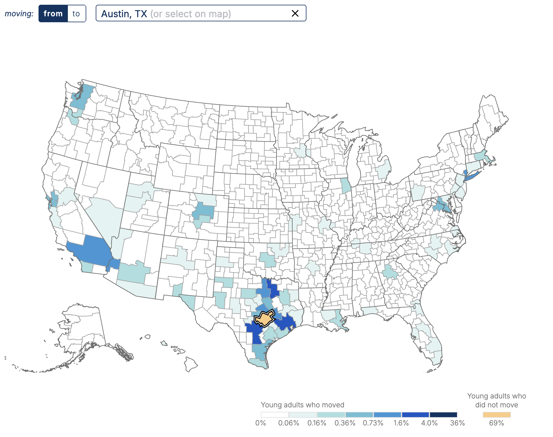 Neat interactive map allowing you to explore how people move in the US. For instance, 70% of folks who grow up in Austin stay, and those who don't relocate elsewhere in Texas move to large cities in other states.