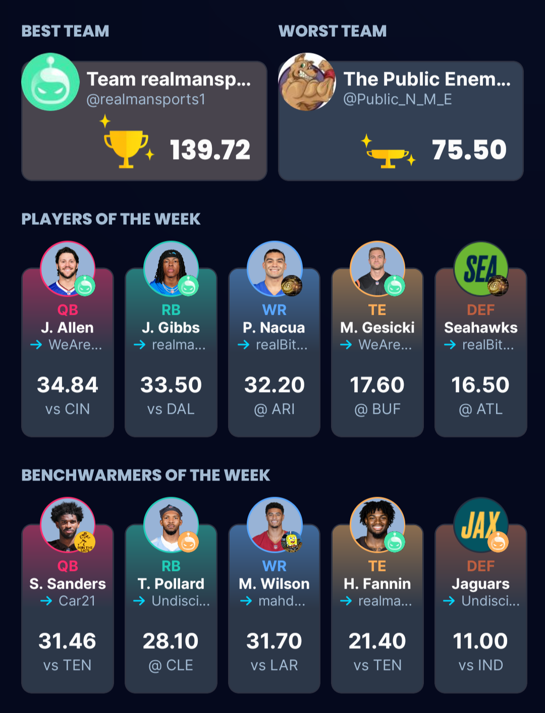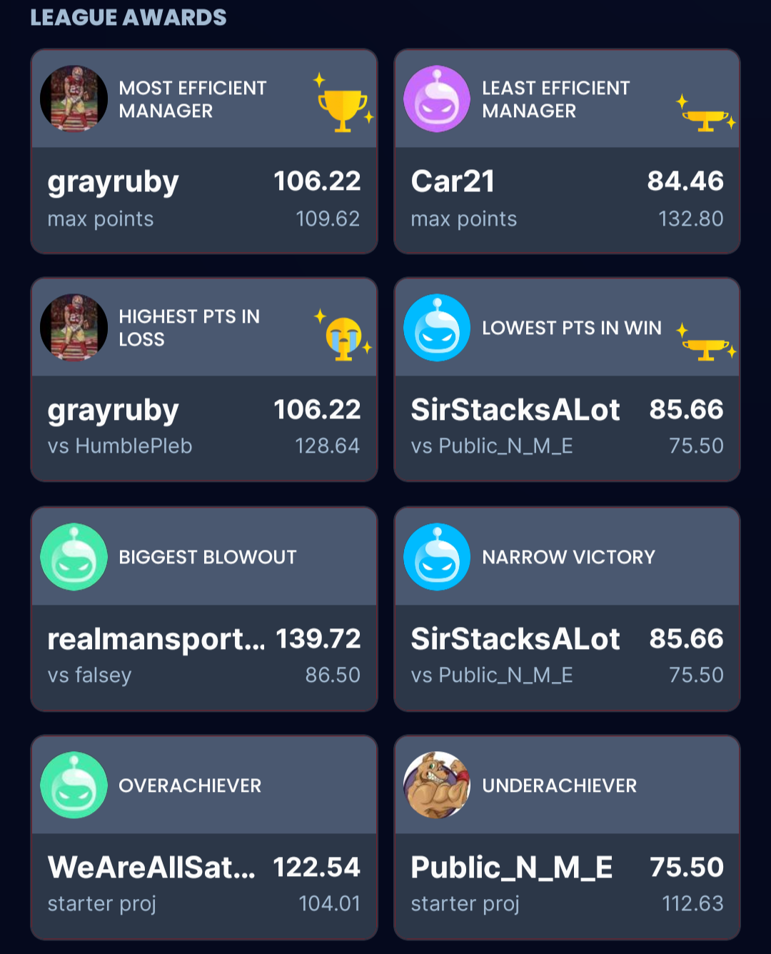 Congratulations to those who earned their first round bye, and commiserations to those who are out of the running. Fantasy Football is a cruel mistress.
