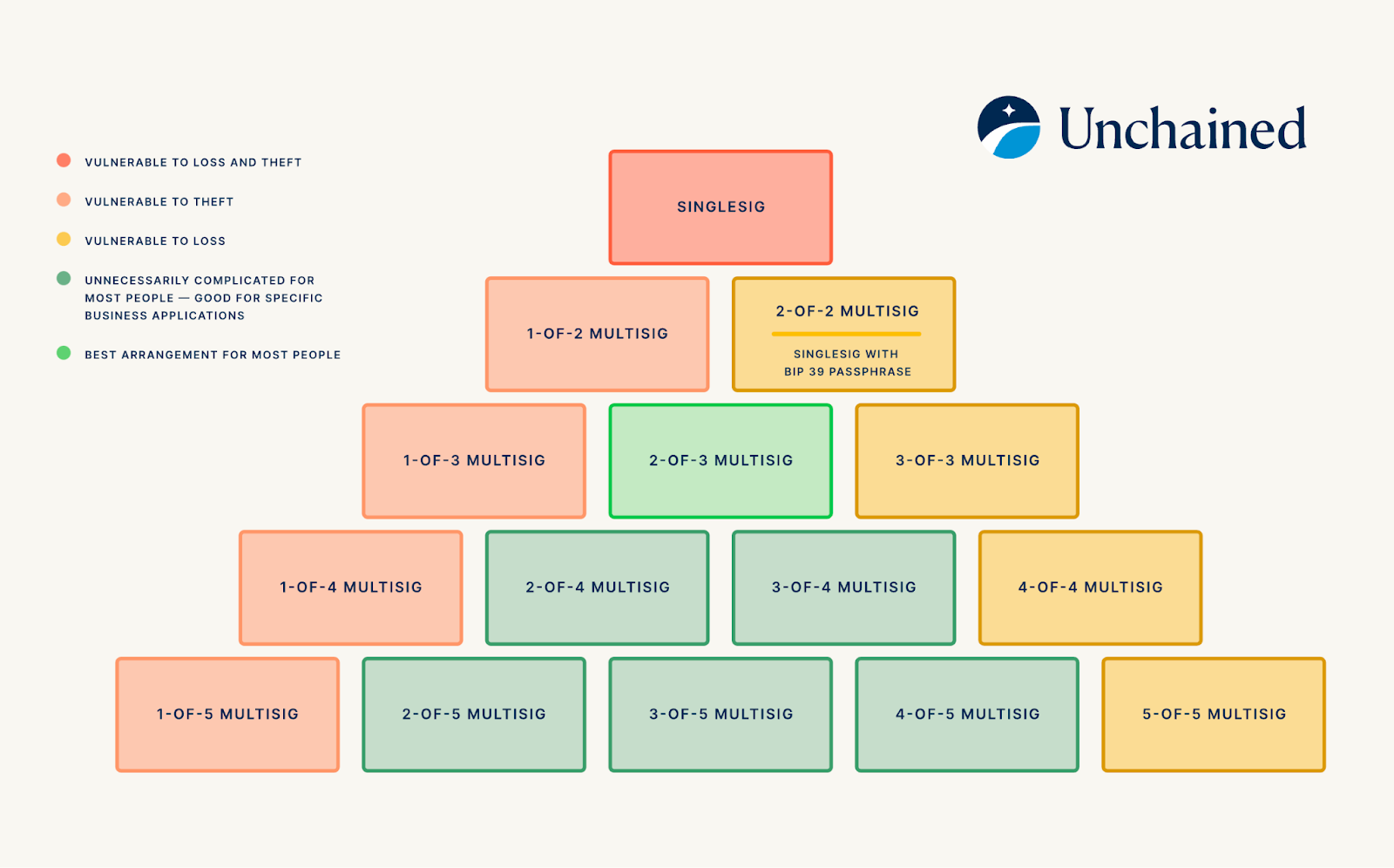 Unchained has led the industry of collaborative multisig bitcoin services for nearly a decade. We’ve built products based specifically on 2-of-3 multisig quorums, which represent the least complicated multisig structure for holding bitcoin without single points of failure. We believe that 2-of-3 is the best choice for most people in most situations, while larger quorums introduce unnecessary complexity.In our introductory multisig article, we created a multisig pyramid diagram to illustrate this concept. We pointed out that 2-of-3 is typically ideal, 1-of-N and N-of-N quorums fail to eliminate single points of failure, and hinted that some quorums beyond 2-of-3 could be useful for individuals or businesses with specific or elaborate needs:Now that Unchained offers support for a larger range of multisig quorum options, it’s worthwhile to conduct a deeper analysis into the strengths and weaknesses of the various choices. This article will take a deep dive into the tradeoffs, so that you can make an informed decision about your bitcoin custody security model. We will begin by introducing a few concepts, such as quorum categories, key categories, sovereign access, and agent failsafes.