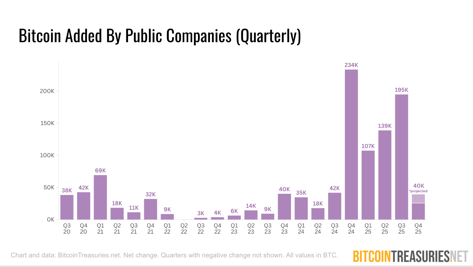 Quarterly momentum is cooling, not collapsing Q4 2025 is projected to close with approximately 40,000 BTC added to public company balance sheets – below each of the prior four quarters, and roughly in line with Q3 2024.