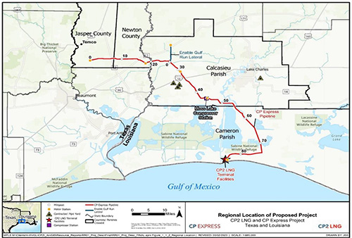 The Moss Lake Compressor Station will connect multiple interstate transmission lines to the terminal. CP Express will supply feed gas consistent with CP2’s planned 28-million-ton-per-year output using a 36-train modular liquefaction system.