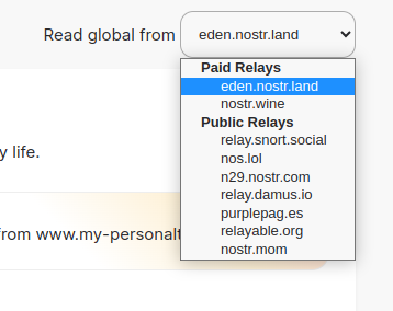Problem: while using Snort, when I go to Global, it always defaults to "Read global from" then uses the first of two "Paid relays". My "Public relays" are in the dropdown and I can switch manually and things seem to go much better. Until...the next time I load Snort, then I'm back to the "Paid relays" and must manually switch again.
