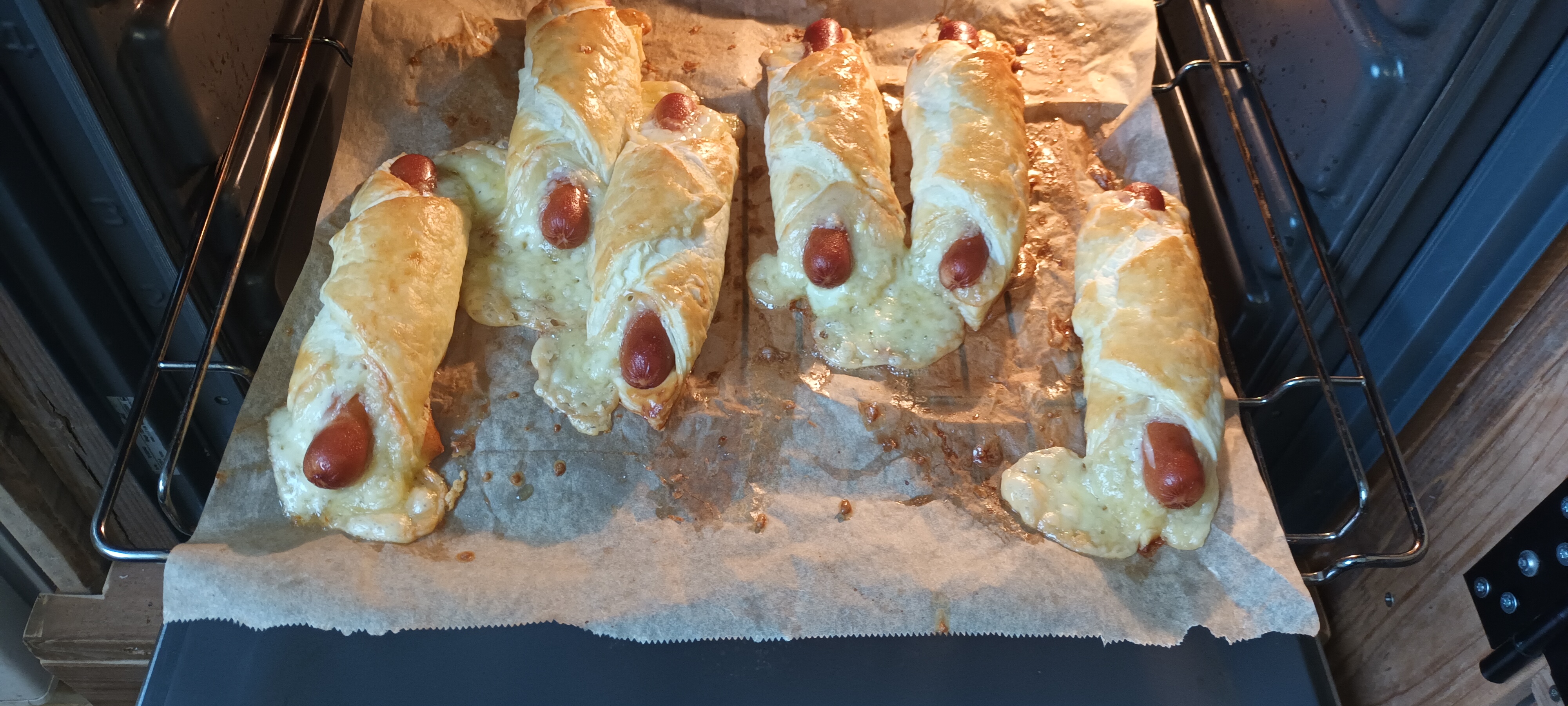 Puff pastry squares, a slice of ideally stinky cheese and wiener. Roll it all, brush with egg yolk. In the oven. Done!