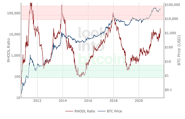 1. RHODL ratio: Compare the amount of bitcoin held for one week with 1-2 years. When this rate gets high, it means there are a lot of short-term holders and the market is perhaps overheated or overbought. It means that many holders are recent and that perhaps they arrived in the excitement of the price increase and nothing guarantees that they will hold for the long term.