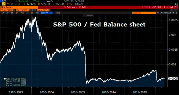 We can see this in the ratio of S&P 500 Index to the Fed’s Balance Sheet. Pre-2008, there was strong fundamental growth in equities with occasional small drawdowns- normal for a stock market operating in a booming economy funded by a credit bubble (that the Fed had helped create). However, after the Financial Crisis, the ratio flatlines- showing that there has essentially been almost NO REAL growth in equity prices. The rallies are now financed by the Fed itself.