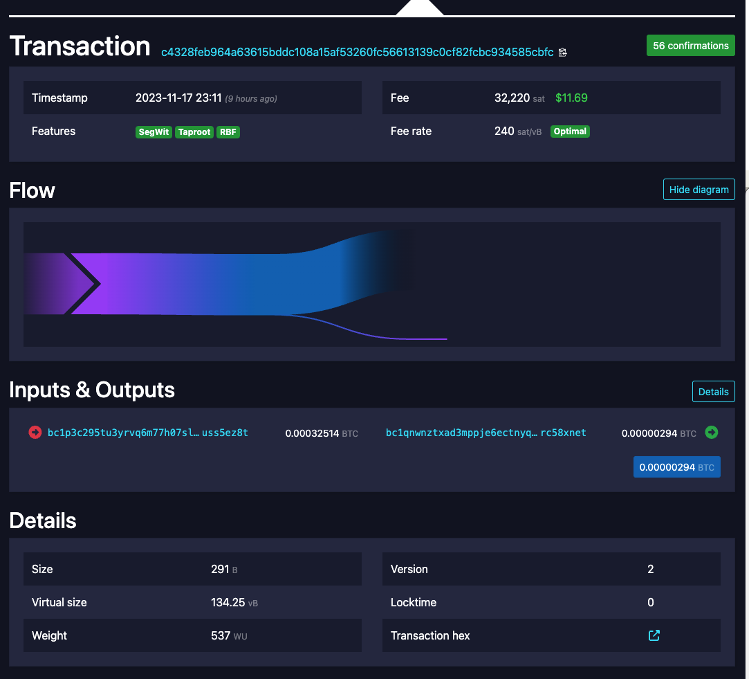 https://mempool.space/tx/c4328feb964a63615bddc108a15af53260fc56613139c0cf82fcbc934585cbfc