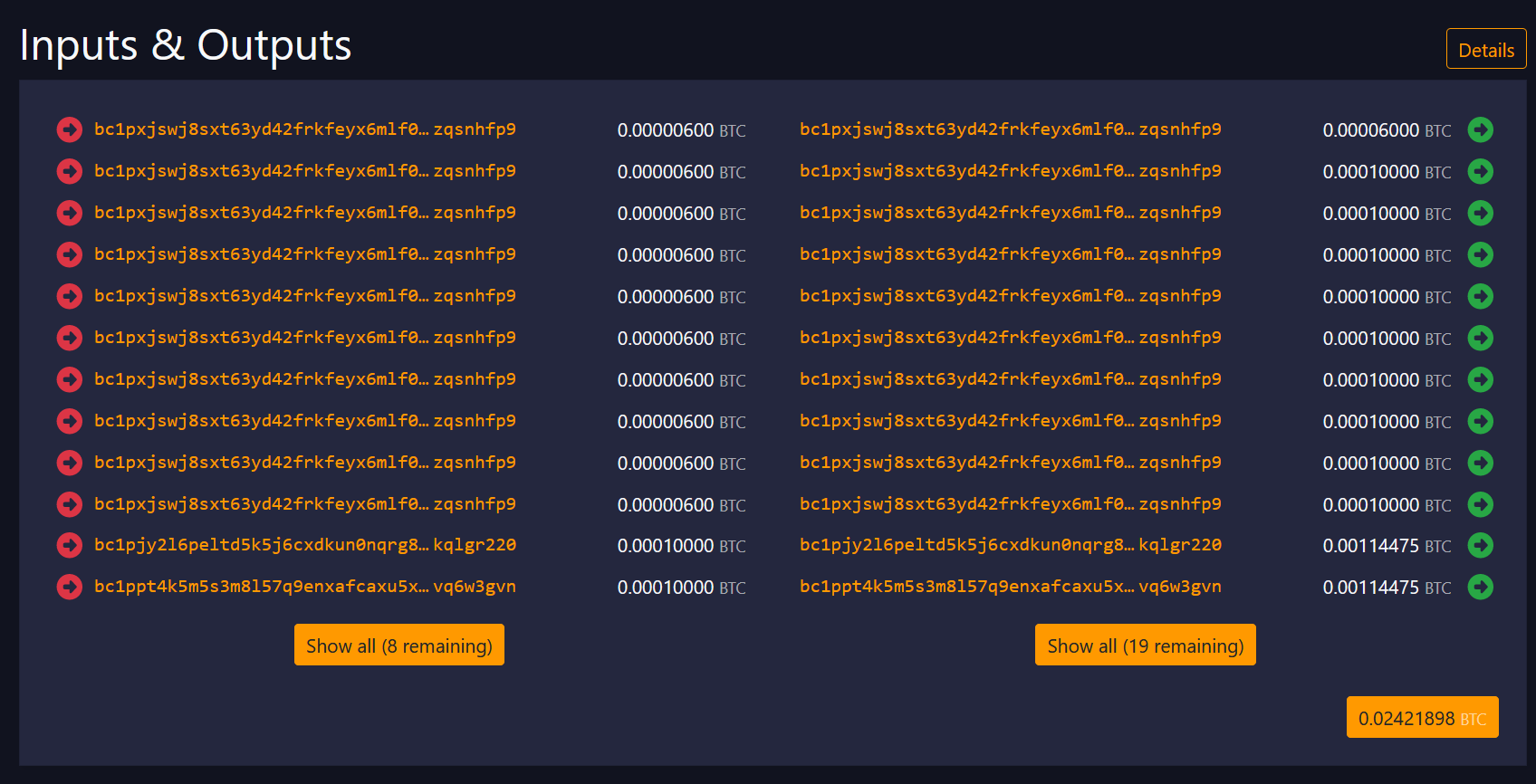 But nearly every block since the fee pump started, we've seen one of these giant taproot UTXO explosion transactions that seems to be just exploding out the contents of a taproot UTXO into 1000 new UTXO distributions: