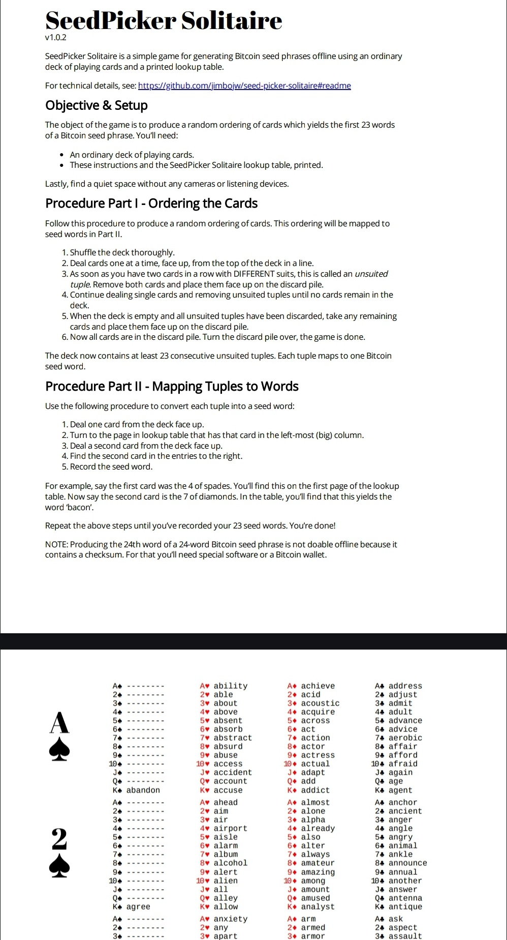 SeedPicker Solitaire is a simple game for generating a Bitcoin seed phrase offline using an ordinary deck of playing cards and a printed lookup table.