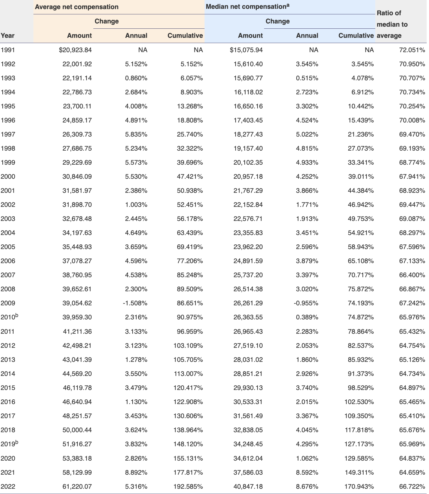 The article implies there's been a decrease in the median wage, but there's been an 8% increase YoY according the SSA. In real terms there's probably a net decrease in the median wage but nonetheless.