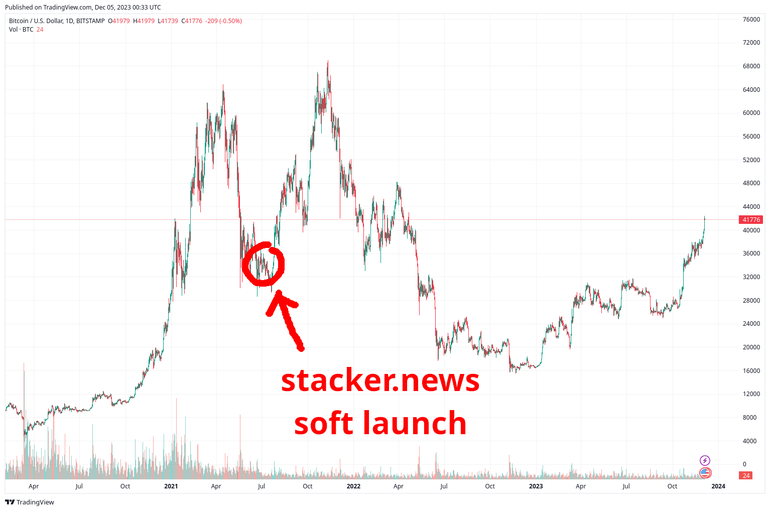 First item was created on 11 Jun 2021. Second item on the same day is about the "soft launch" (never heard of this term before but I like it!). Price at this day was around $37k.