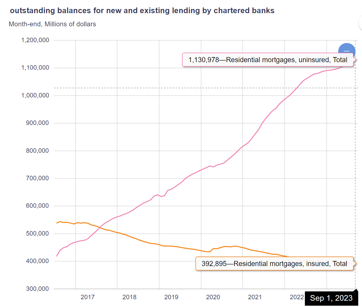 The mix of insured to uninsured mortgages in 2017, was around 50-50. But now, the % of insured has shrank to below 26% - and dropping.