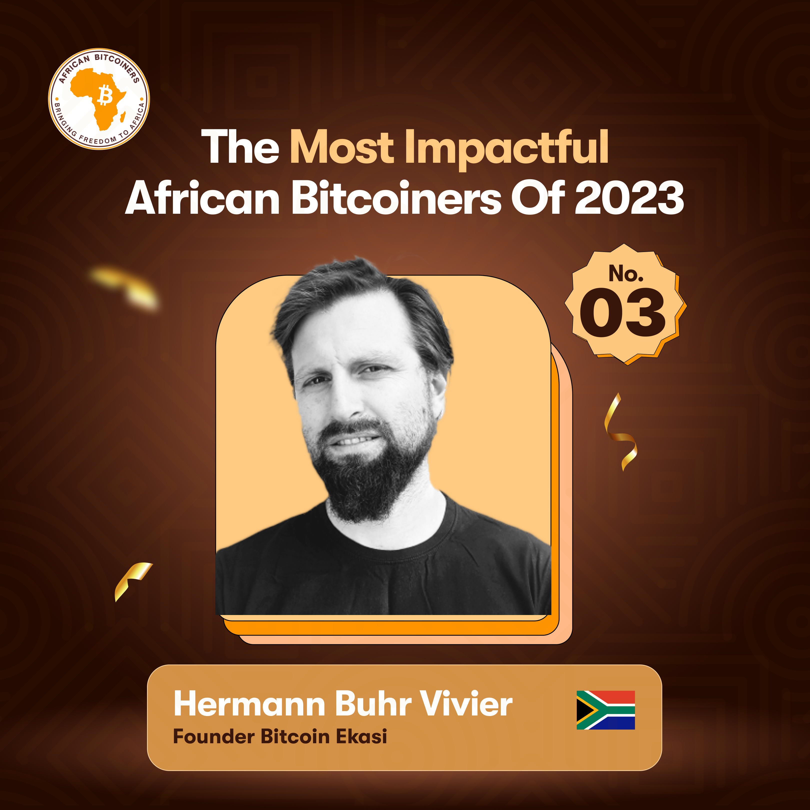 Our 3rd most impactful African Bitcoiner of 2023 is Hermann Vivier, co-founder of The Surfer Kids and founder of Bitcoin Ekasi. He is also the co-convener of Adoption Bitcoin Conference in Cape Town. Thank you, Hermann, for your incredible work! https://bit.ly/miab23