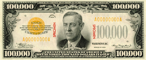 The word “money” comes from the Latin word “moneta”, which was the name of the goddess of finance in ancient Rome. The largest note ever printed by the US Treasury was the $100,000 bill. It had a picture of Woodrow Wilson on it and was used only for transactions between Federal Reserve banks. It also had the word Specimen on it! Oh and don’t forget the new Trillion dollar coin! What’s the next stop?