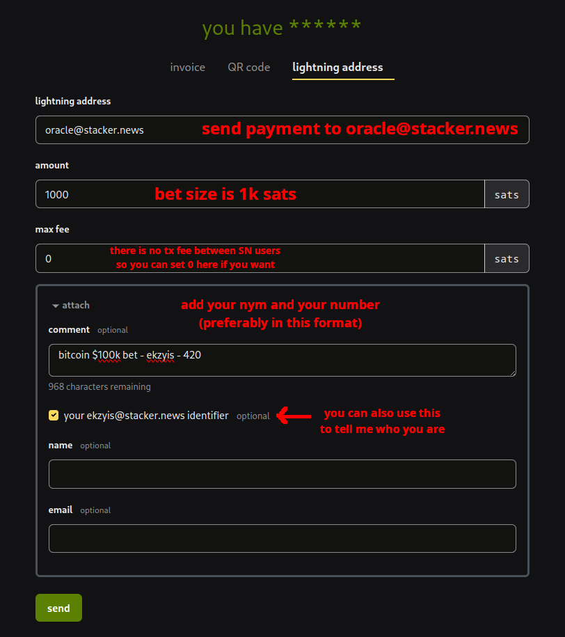 - Pay @oracle 1k sats via LN address since this allows you to add a comment to the payment: