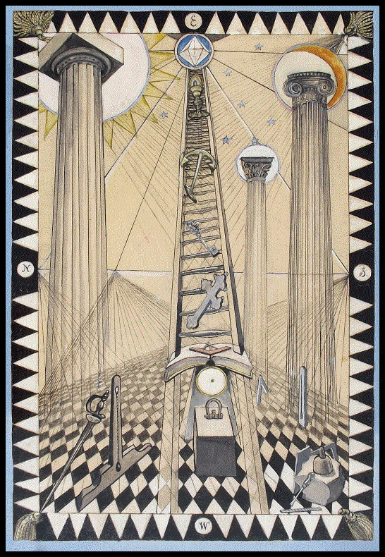 Here is a Freemasonic Tracing Board: (below) The floor is where the common people are and they live in a dynamic of white and black, light and dark, yin and yang. Until the people / initiates start to climb the ladder (allegory). The large pillars are black and white. Sun and Moon. If you were uncomfortable with Darth it is not him, it is you, You realize that the black knight has jumped your pawn or maybe your queen!