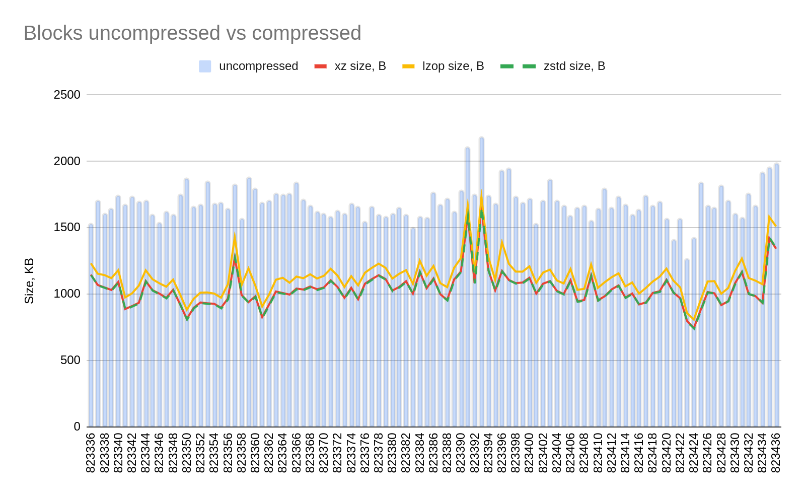 Compression ratios for blocks using the following algorithms: xz, lzo, and zstd: