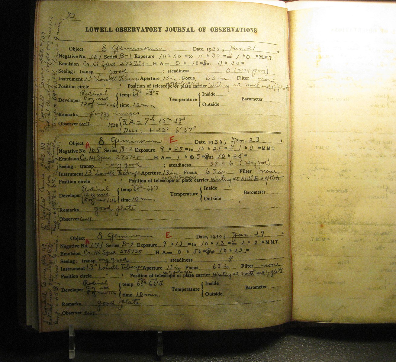 With the ashes was the inscription: "Here within are the remains of the American Clyde W. Tombaugh, discoverer of Pluto and the third zone of the solar system, son of Adelle and Muron, husband of Patricia, father of Annette and Alden, astronomer, teacher, jokester and friend: Clyde W. Tombaugh (1906-1997)."