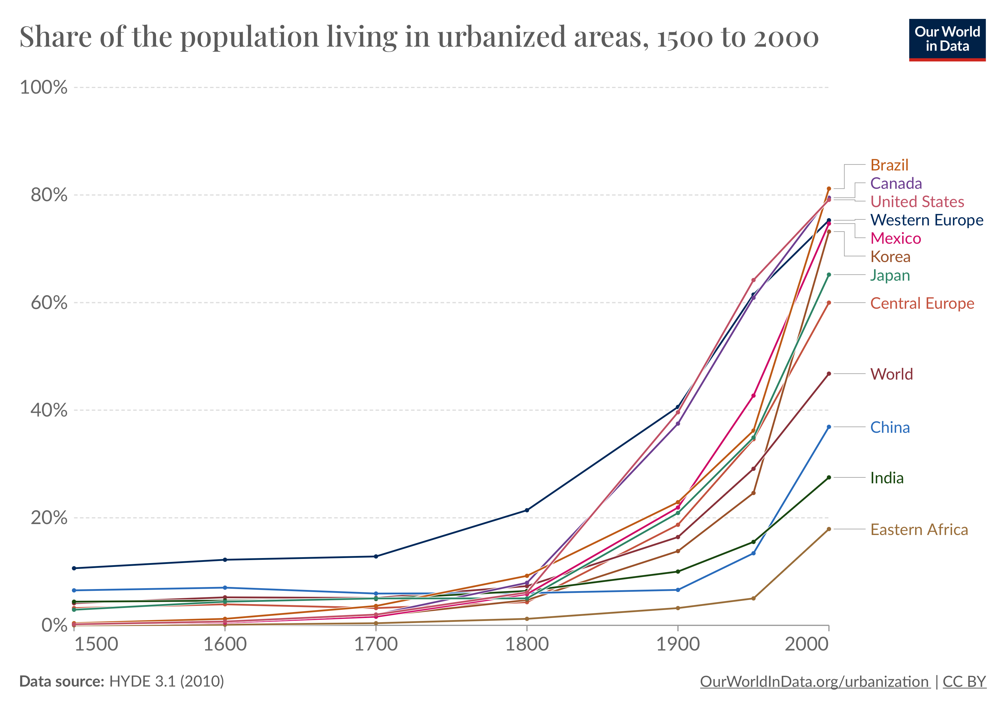 Pretty amazing chart showing that we basically went from nobody living in cities to mass migration to cities all over the world in a couple hundred years.