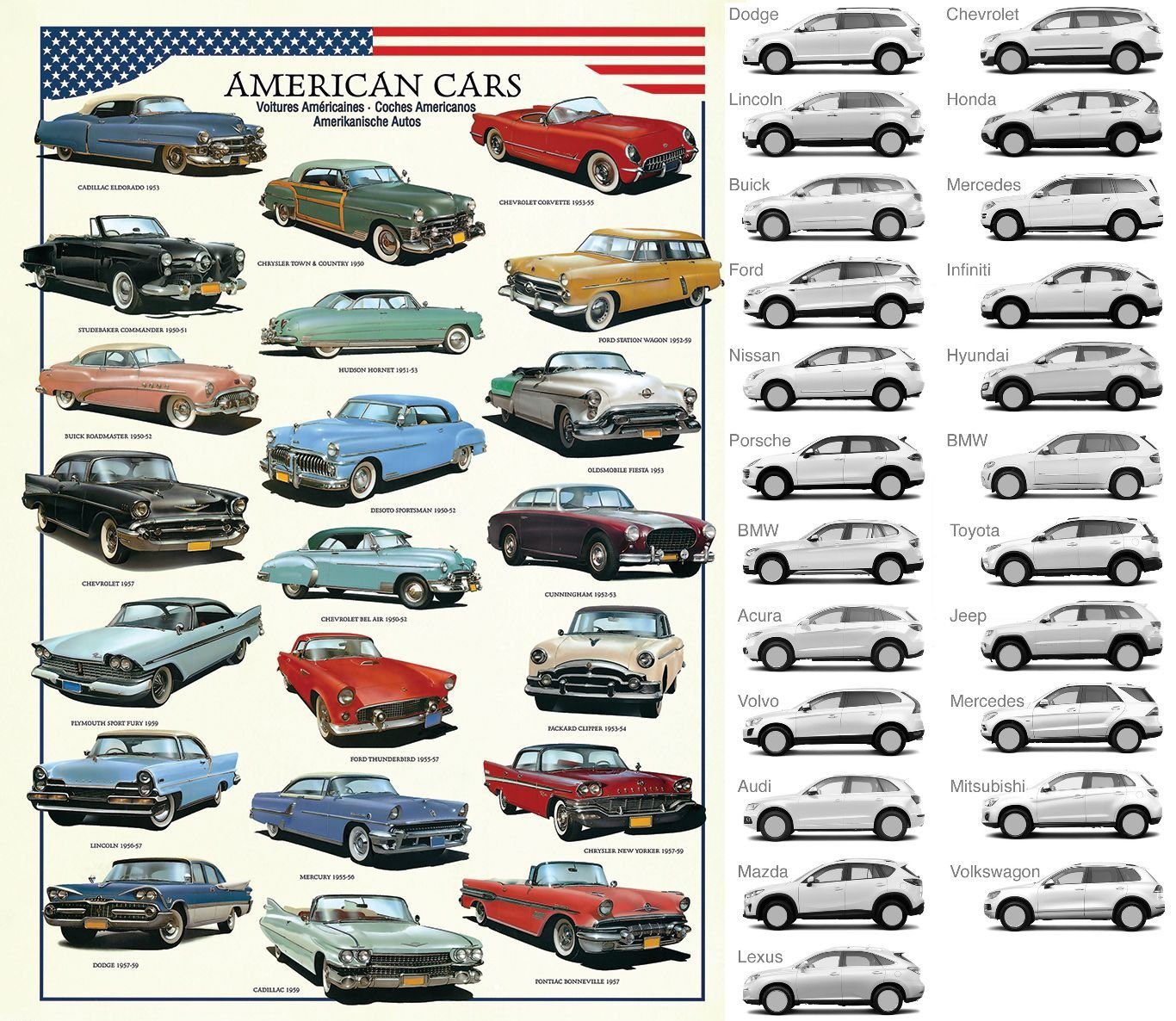 For the American cars, the image on the left shows cars in many different colors at various angles. On the right, all cars are white and shown at identical angles. It also only includes cars of a certain category. Throw in a mini cooper, VW bus, or a Porsche and things look different. The inside of cars is drastically changing with electric vehicles and endless sensors and software.