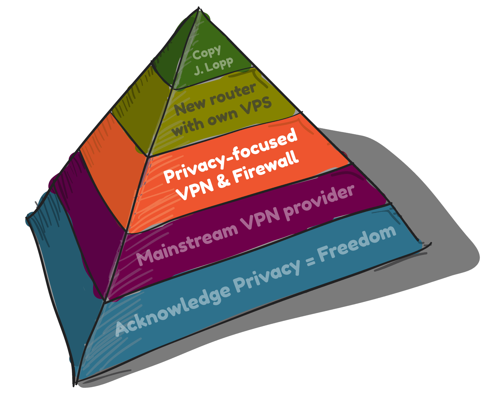 Rather than even attempt to describe what to do here, just go & read Jameson Lopp's article which was posted by @k00b here on SN . The guide runs through the entire $475 hardware stack, configuration & installation process, with some great diagrams of a 'perfect' setup. This seems to be the holy grail for us improving our network privacy. One day we'll all get there and be at the top of the pyramid yelling "yeehaa". For today though, we'll take it easy and simply buy a privacy-focused VPN with our hard-earned sats...