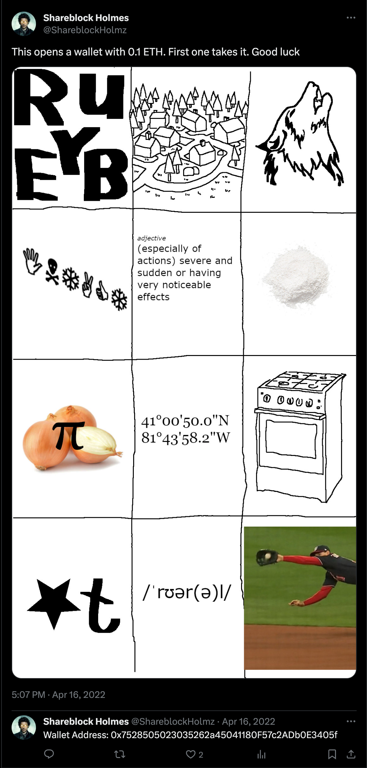 The pictures are clues to a BIP39 seed which unlocks 0.1 ETH