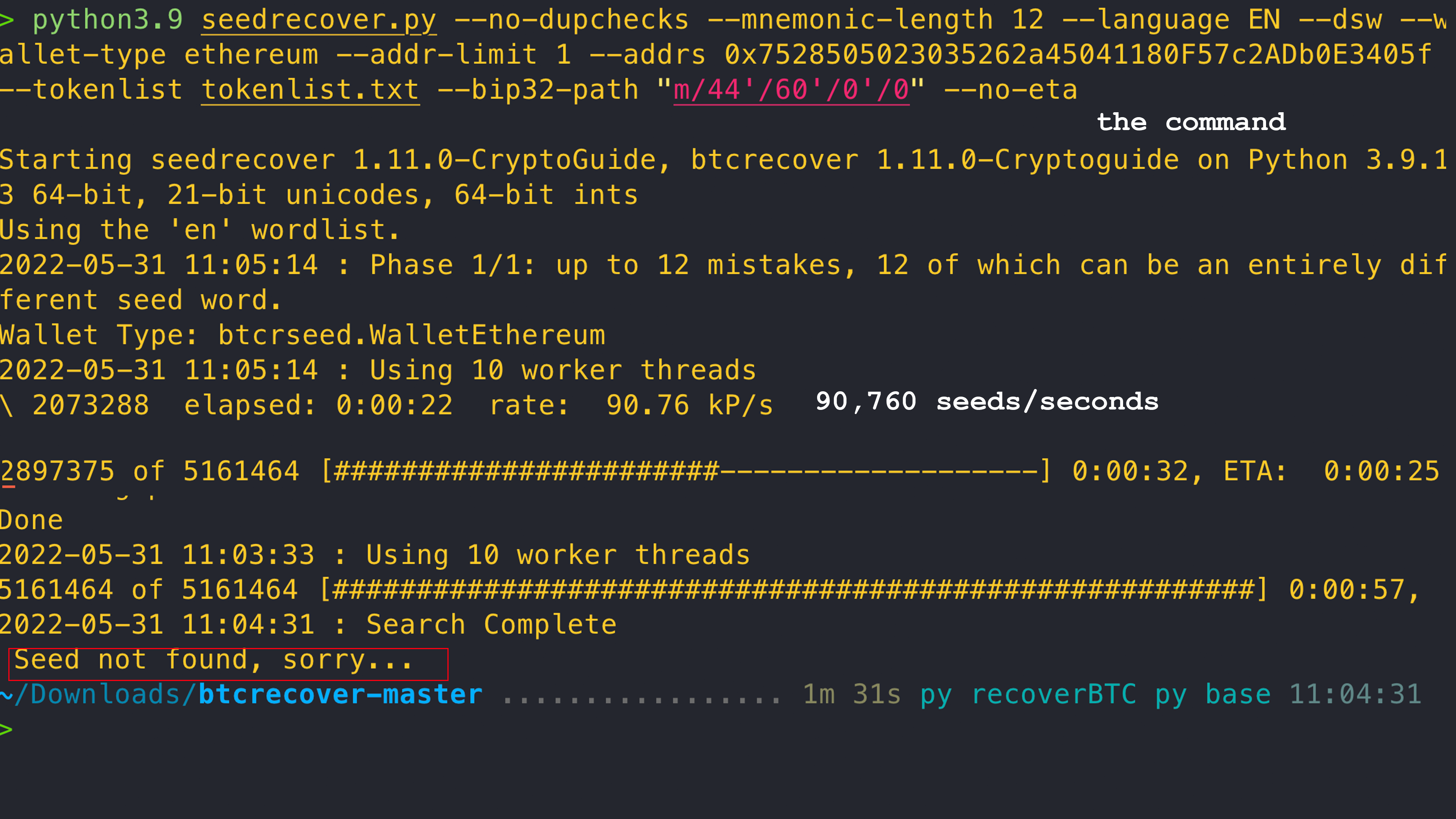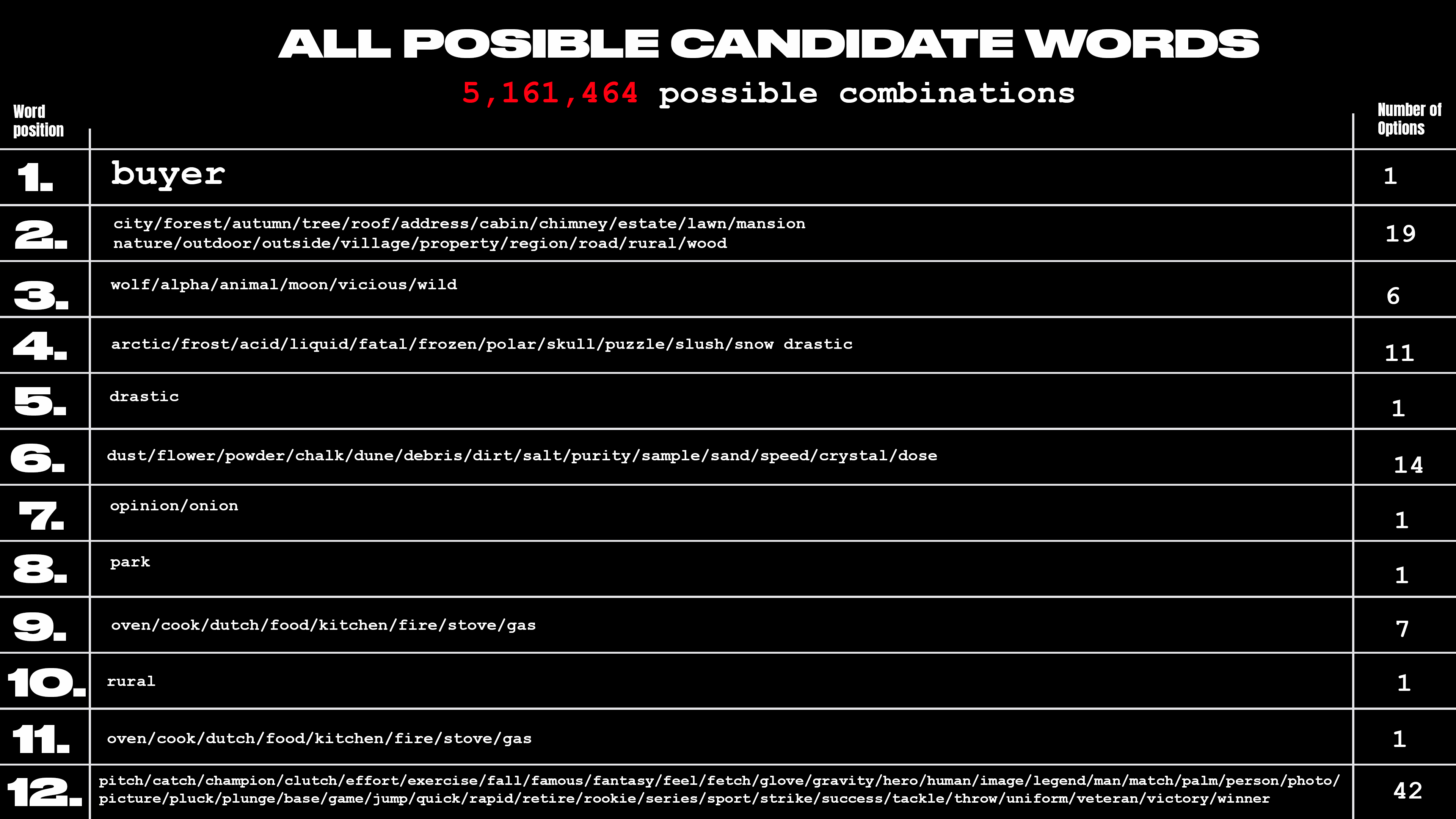 It would take 11 hours to try all my candidate words, and on the 4th & 12th positions try all 2048 possible words.