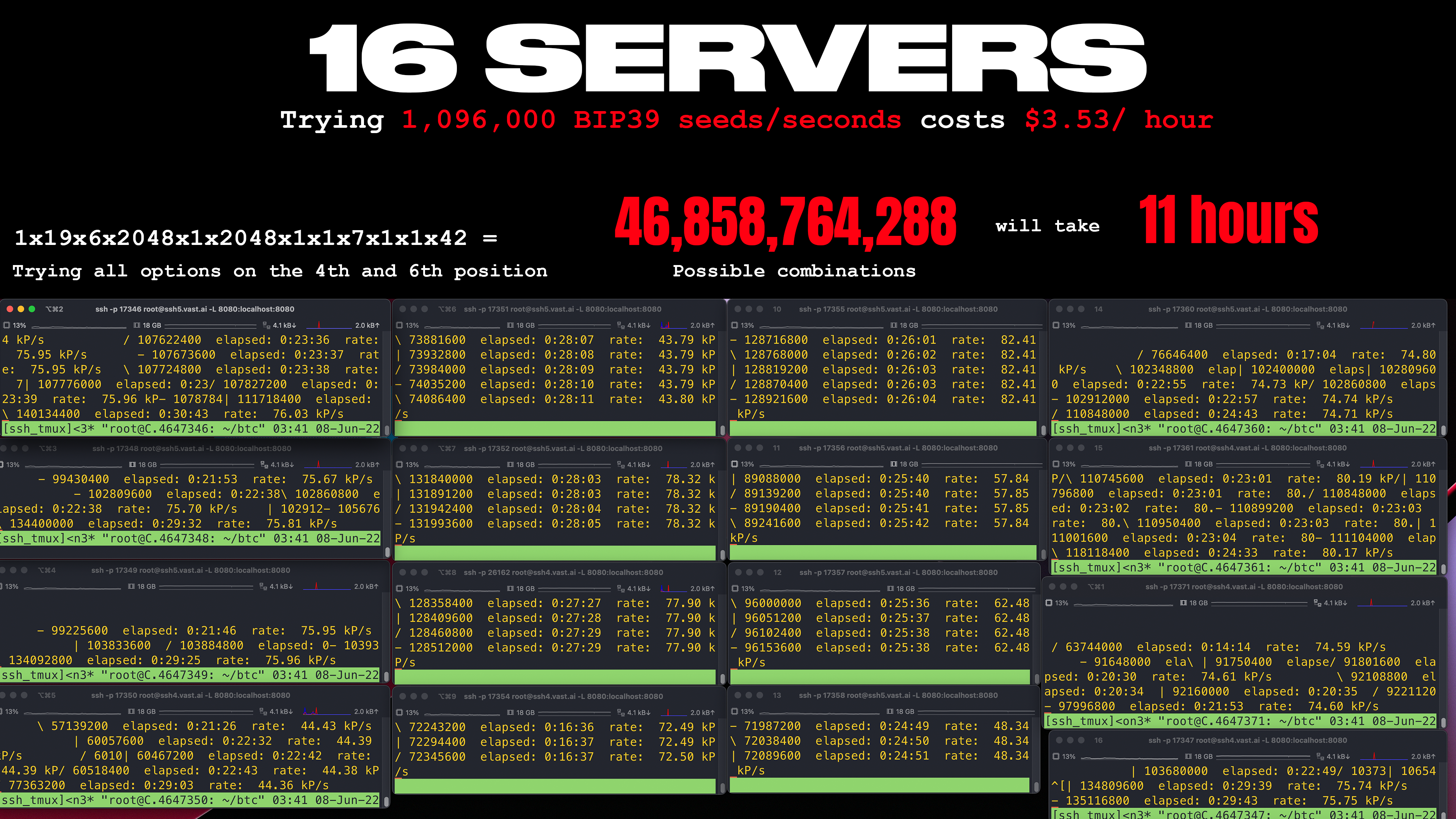 Ended up renting 16 servers and I was trying 1,096,000 seeds per second.