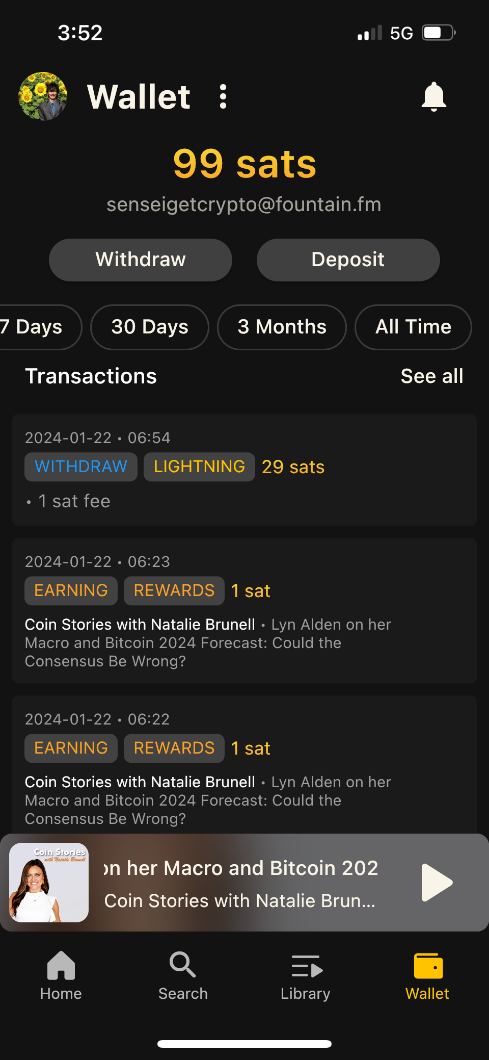 I have a 50-minute commute so I usually listen to Fountain on my way to and from work. On the rare occasion that I cannot find an episode I want to listen to on Fountain, I listen to audiobooks. (I recently started Lyn Alden's "Broken Money," and it's outstanding.) My commute has become far less frustrating as I focus more on consuming useful information and less on the idiotic behavior of certain drivers. Rather than trying to get from point A to point B as fast as possible, it feels like time well-spent that would otherwise be wasted. All of which has the positive benefit of encouraging me to take my time and drive slower, saving me money on gas. So Fountain is actually benefiting me beyond just paying me sats for listening!