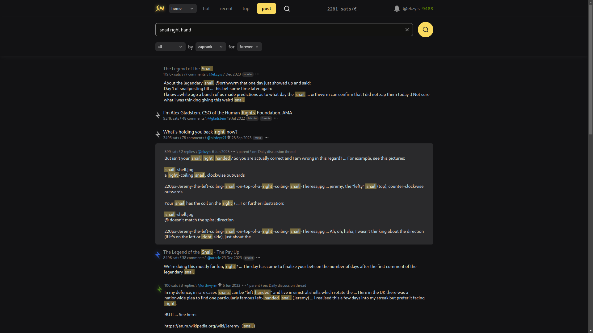 Our search got pretty good now, I immediately found the comment simply using "snail right hand": #188834