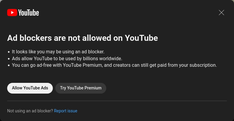 I've already only barely tolerated youtube and only went there when the things I want to see aren't to be found on other platforms, and then with a curse on my lipsAlthough Brave still seems to work, on a quick attempt