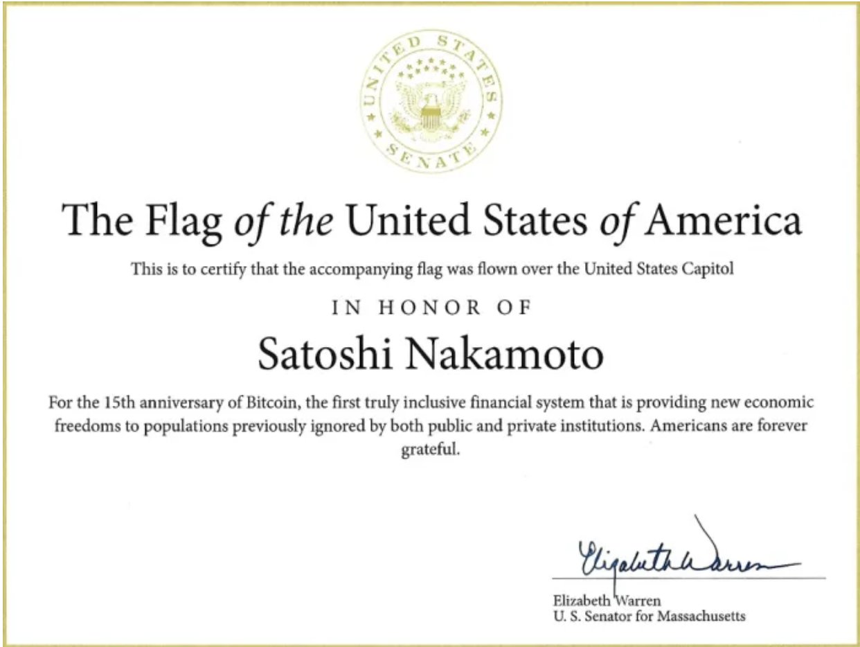BREAKING: Elizabeth Warren signs a certificate to honor #Bitcoin creator Satoshi Nakamoto with a ceremonial flag flying. "Americans are forever grateful." 🇺🇸