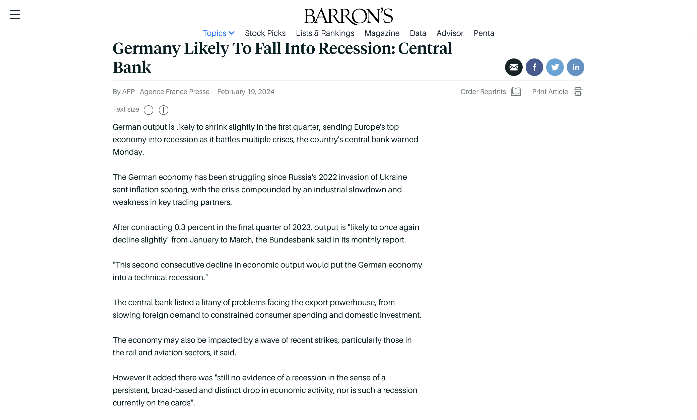 The German economy has been struggling since Russia's 2022 invasion of Ukraine sent inflation soaring, with the crisis compounded by an industrial slowdown and weakness in key trading partners.
