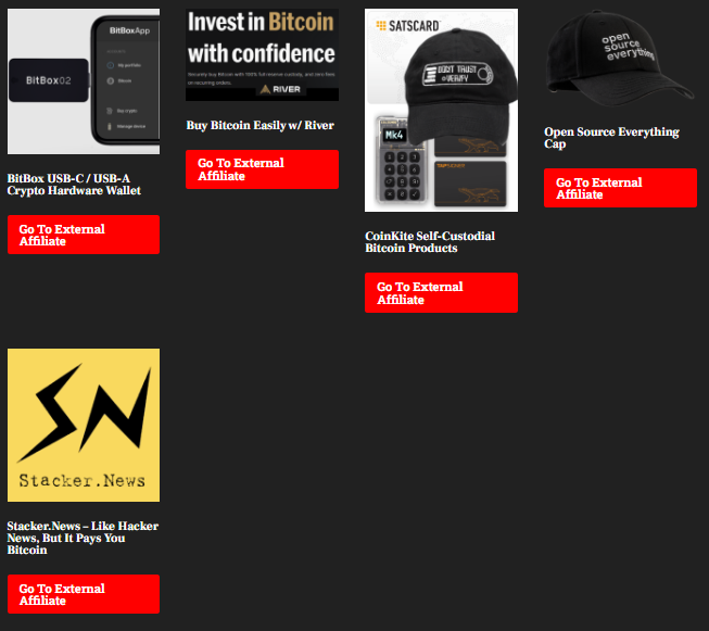I'm rounding out my product store with some affiliates for Bitcoin products. Not 'who pays the most' but instead choosing what products make a good onboarding experience and/or I can believe in, or are recommended by those who know what they're doing :D