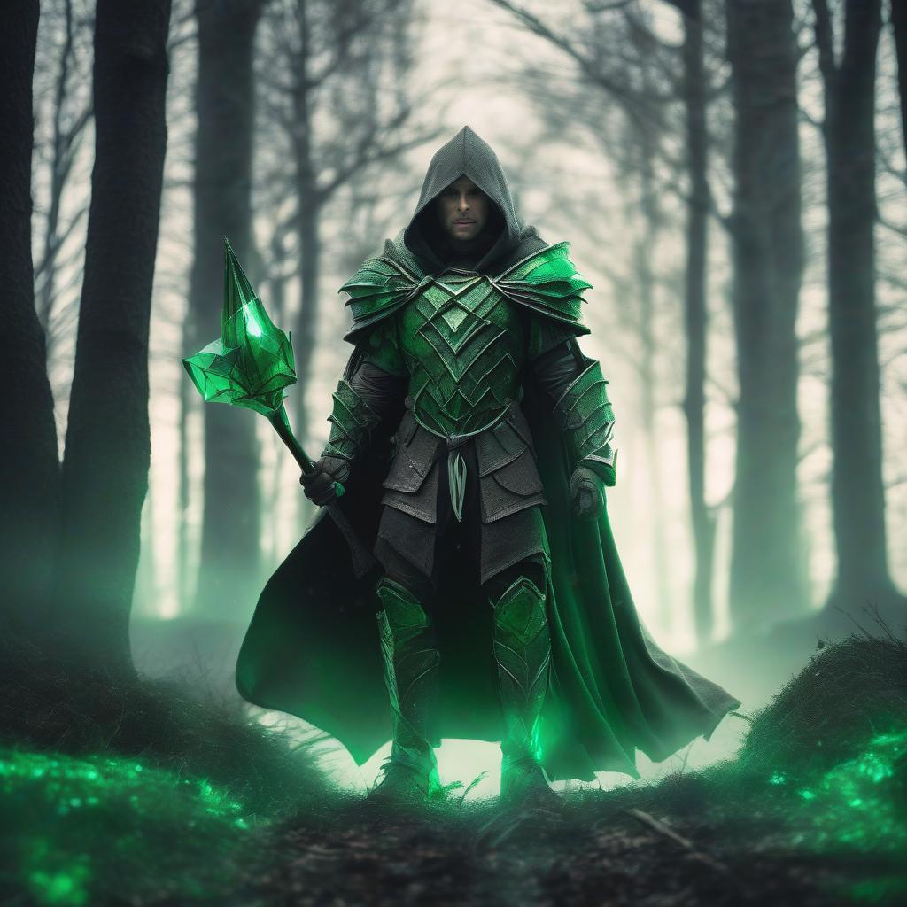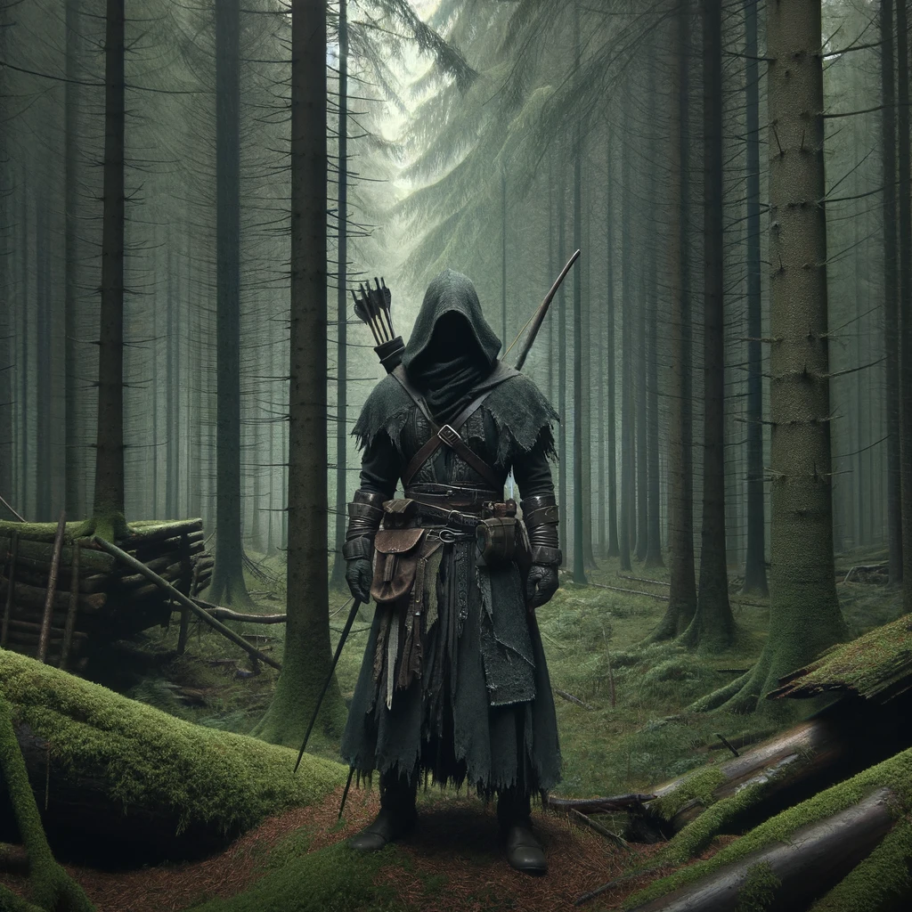 A warrior standing in the woods, overcast lighting