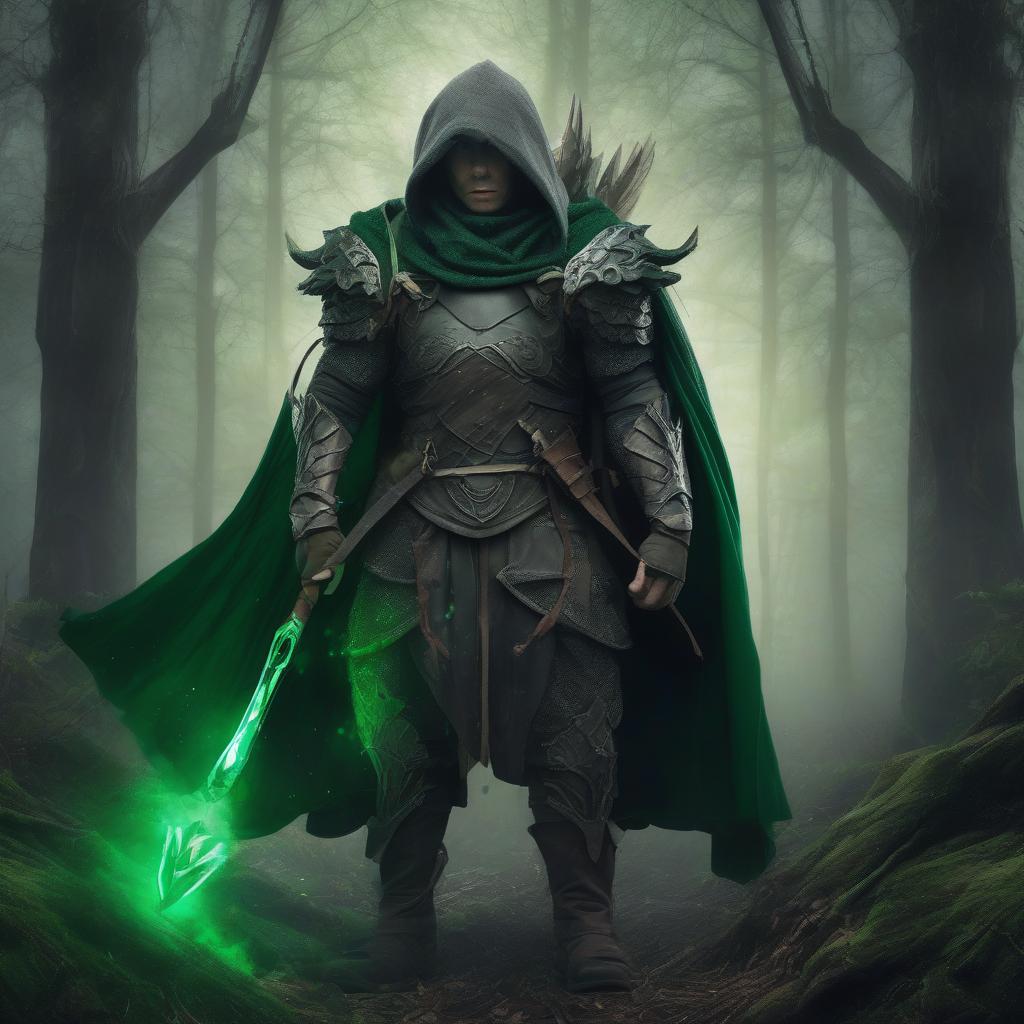 Wearing a dark gray cloak and dark green armor, can’t see face