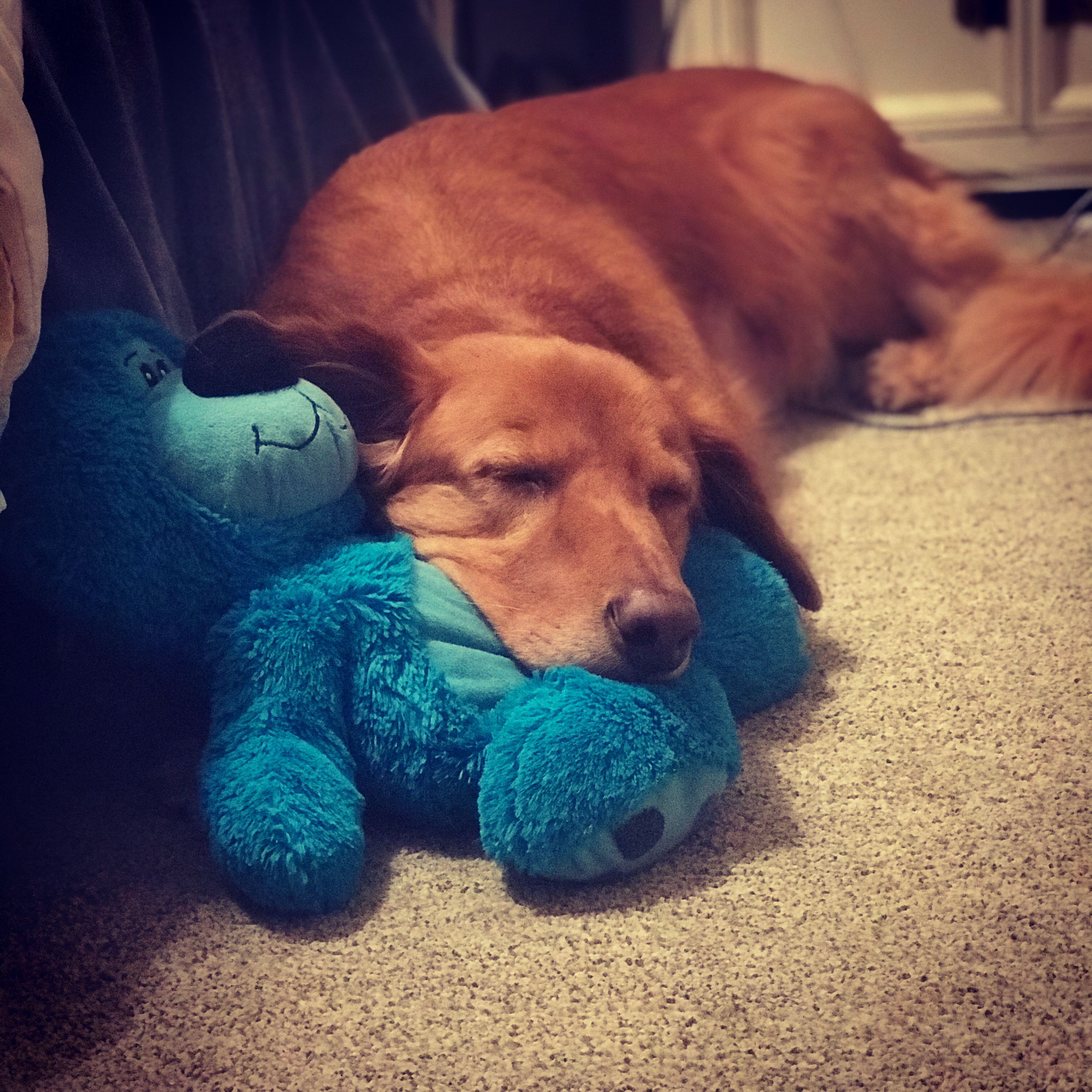 In May 2021, I lost my best friend and the dog Rusty. Rusty was by my side for my recovery from a concussion that caused me to lose 8 months of memory and 3 neurosurgeries. As a golden retriever, we did not know he was sick as it is not in the breed to show health issues, but being the best boy he was he made a huge recovery and instead of the 2 weeks the vet gave him he lived another 15 months! My mom went above and beyond for him and honestly Rusty ate better than we did with his own meals cooked each day! Here is a picture of my goofball on his favorite bear!