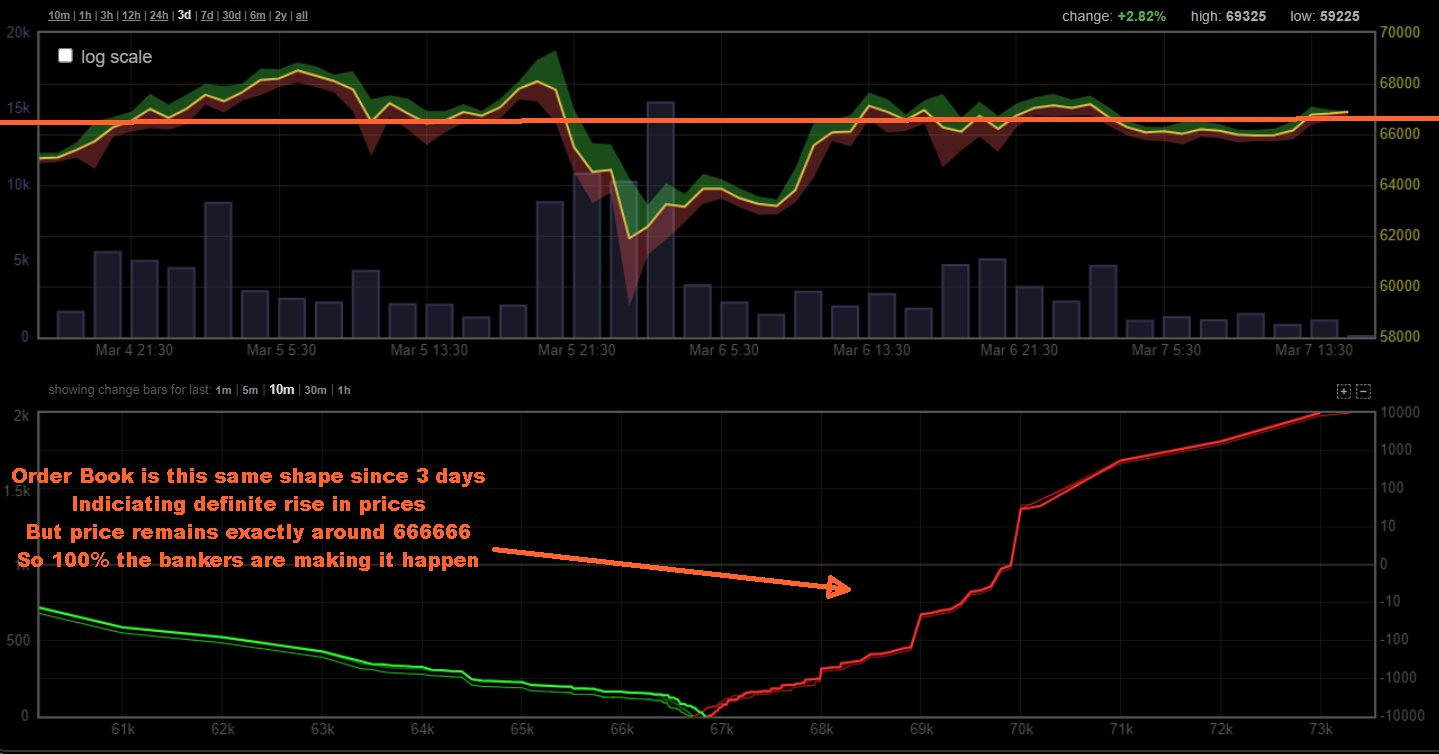 Since 3 days every time I check the chart, it's hovering above 66500. Today is Day 3 and it is magnetically stuck on that band all day! It seems the bankers have fixed the price of bitcoin at 66666, lol where are the plebs? Please make this meme come true!