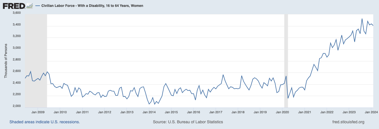 Maybe isn't a new thing but, as Bitcoin, there's also this trend going up and look's like isn't stopping! How's that, since 2021 we have a massive 30% increase in people with disabilities[1] since Mar 2020? Pandemic related? It's a fact, or just people claiming to be?