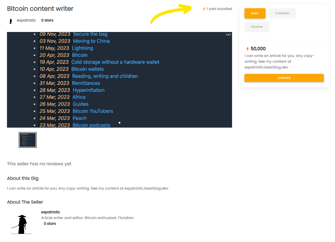 User Expatriotic is the first user to boost their gigs on Bitcoiner Freelance.