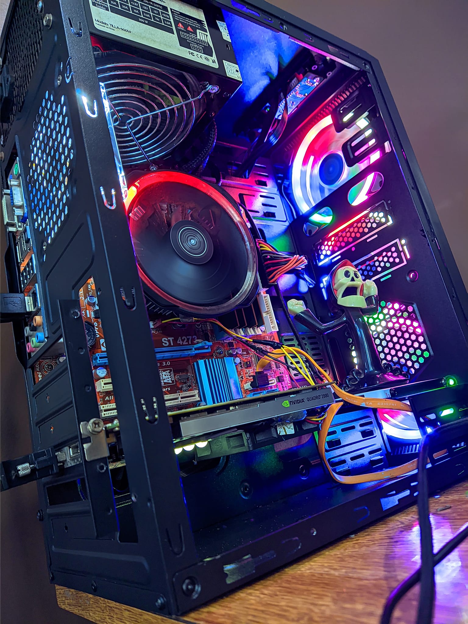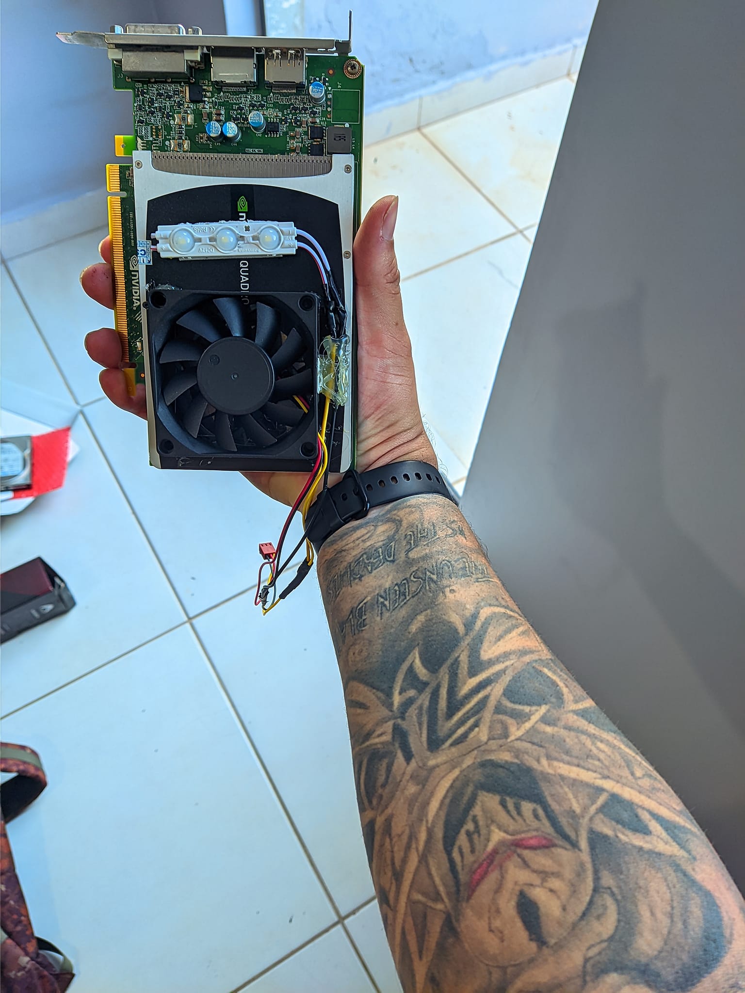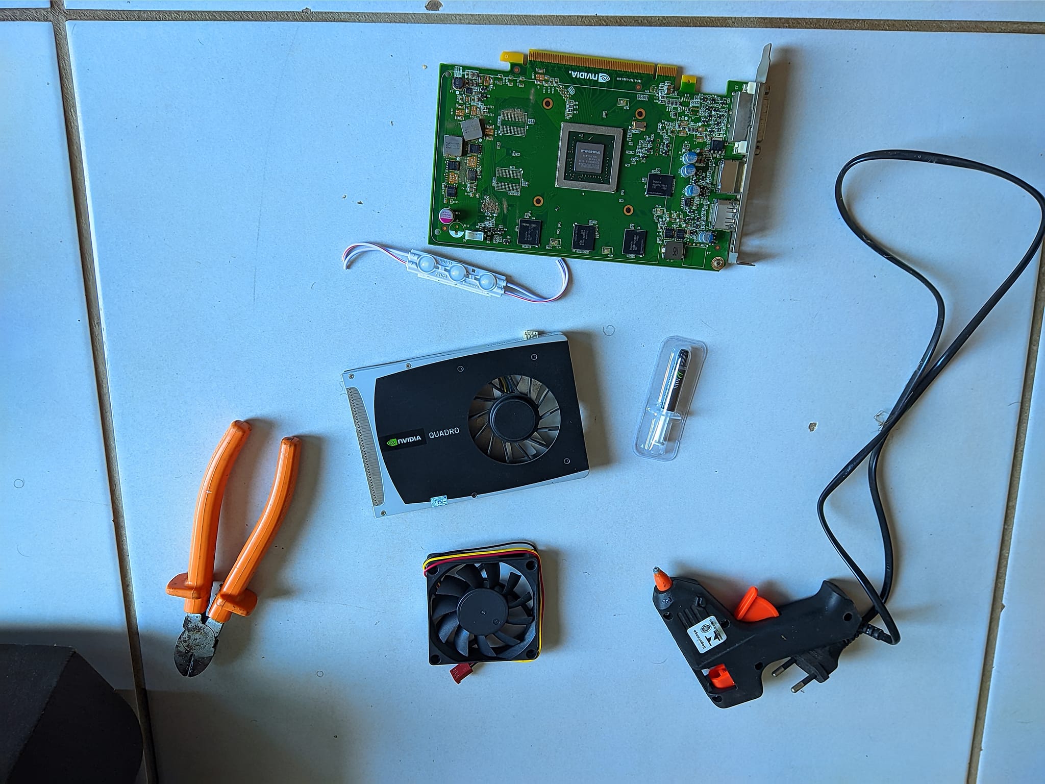 My girlfriend's computer had an NVidia Quadro 2000, but it was getting very hot and had never been opened, I opened it to change the thermal paste and I already took the opportunity to do some tricks that made my hand start to shake, I put a 60mm cooler and a little tape white LED, I connected one to the other at 12V, I glued the cooler with hot glue and the double-sided LEDs, I closed everything, I applied thermal paste and here is the result.