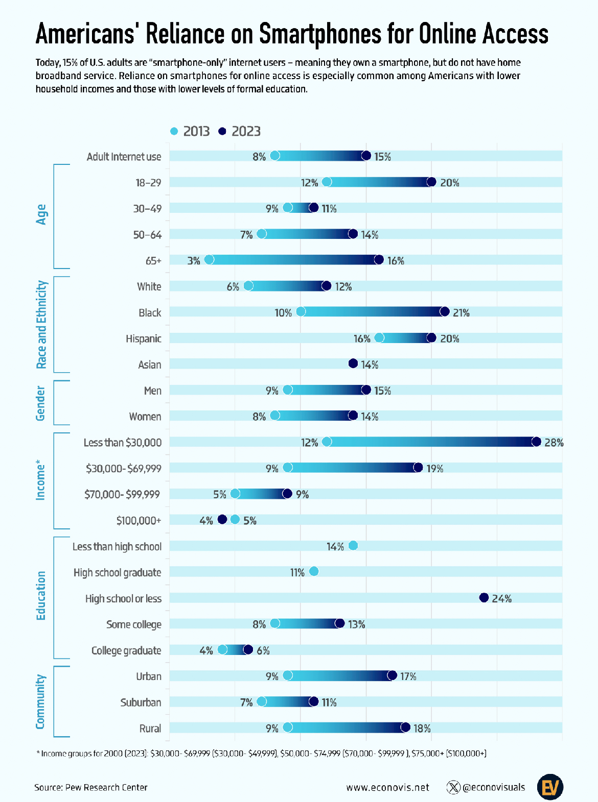 100k+ is the only category that reduced reliance on smartphones. It suggests most high paid work involves a computer of some kind.